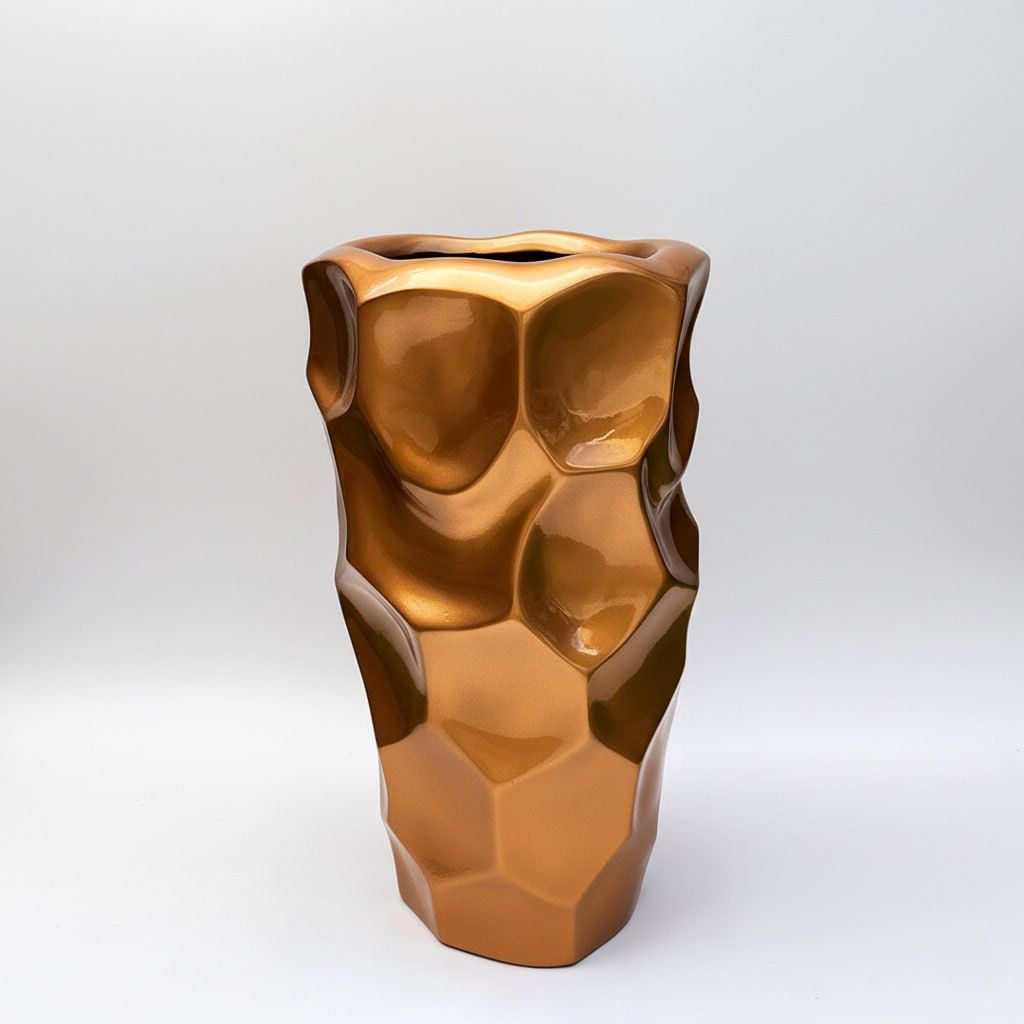 Mendels Gold Rock Fiberglass Flower Planter, a stunning piece measuring 90cm in height by 30cm in diameter. With its striking rock-like texture and luxurious gold finish, this planter combines natural inspiration with a glamorous twist, creating an unforgettable focal point for any environment.