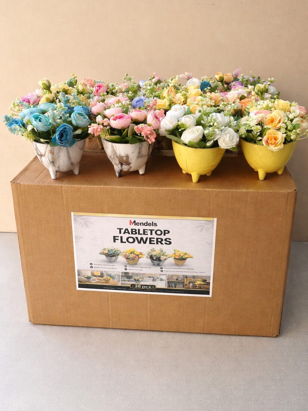 This carton includes 36 pieces, making it perfect for large-scale decoration. Mendels tabletop flowers are ideal for businesses that need consistent décor across multiple spaces. They are widely used in hotels, restaurants, and event venues.
